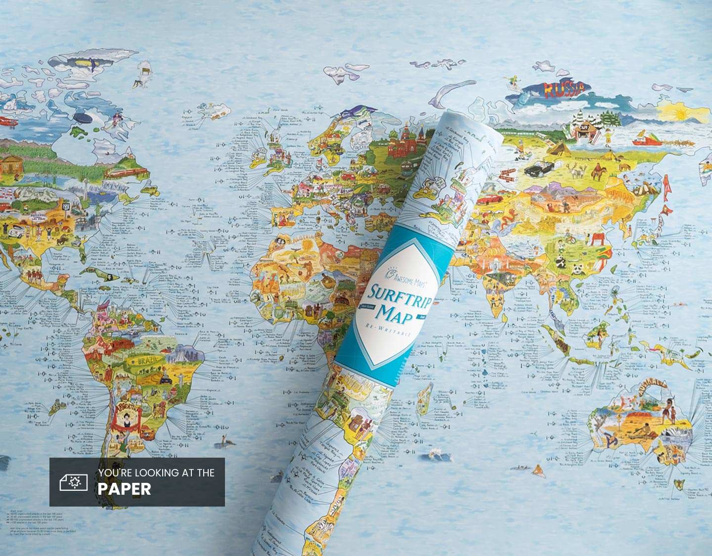 Hand drawn illustrated wall map on premium poster paper, 22" x 38". A world map with over 1000 surf spots and surf beaches, information about wave quality, water temperature, peak season, shark attacks and more. A true staple for every surfer! Ships rolled in gift tube.